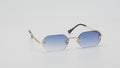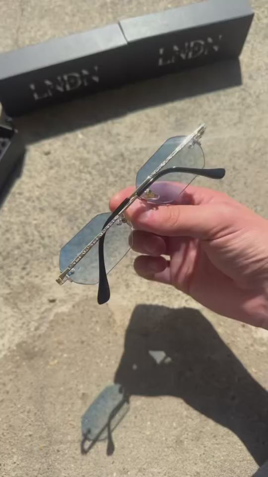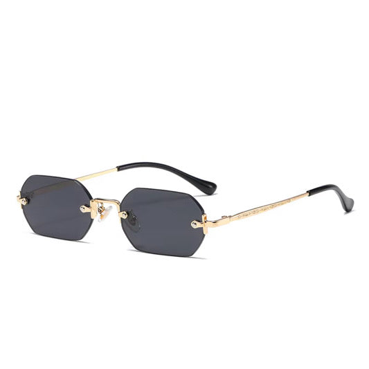 Light as air. Sharp in style. Aura brings refined simplicity to the spotlight with its octagonal rimless lenses, sleek gold arms, and subtle curves. Designed for a barely-there feel and a standout look, these sunglasses are available in black, blue, and gradient grey lenses.